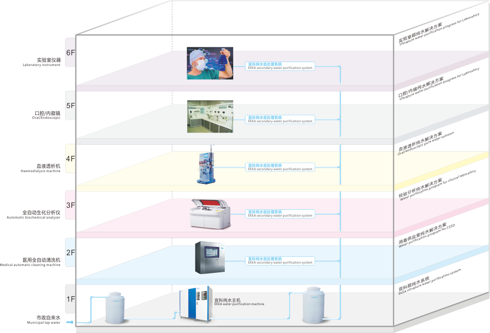 無論清洗消毒機、血液透析機、內(nèi)窺鏡、口腔設(shè)備、全自動生化儀、實驗分析等用水儀器是在一座大樓的同層或不同樓層,還是在不同的大樓,宜科均可配合最合理管路路徑與之實現(xiàn)無縫連接,通過管路同主供水系統(tǒng)相通,形成自動循環(huán)完成水的初級處理和儲備,再通過各后處理系統(tǒng)完成水的分質(zhì)分級處理,滿足不同用水設(shè)備對水質(zhì)需求的不同。